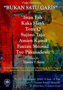 Iwan Fals, Kaka Slank, Tony Q Rastafara, Sujiwo Tejo, Tyo Pakusadewo, Amien Kamil, dan Fauzan Moosad menggelar pameran lukisan bertajuk “Bukan Satu Garis” di Galeri Cipta II Taman Ismail Marzuki, Jakarta Pusat.