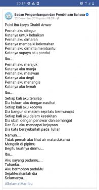 Dan di bawah ini hasil temuan screenshot Holy Adib pada “puisi sampah” (Istilah Saut Situmorang) yang bertitel Ibu, adalah bukan karya Chairil Anwar (CA), tetapi Badan Pengembangan dan Pembinaan Bahasa, Kementerian Pendidikan dan Kebudayaan memostingnya sebagai karya penyair CA. (NJ, Tukang Posting di Website Sastra-Indonesia.com).